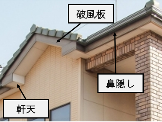破風板・霧除けのほかに、軒天や鼻隠しの名称に関してよくご質問をいただきますので画像を参照していただき一緒にご回答いたします。
